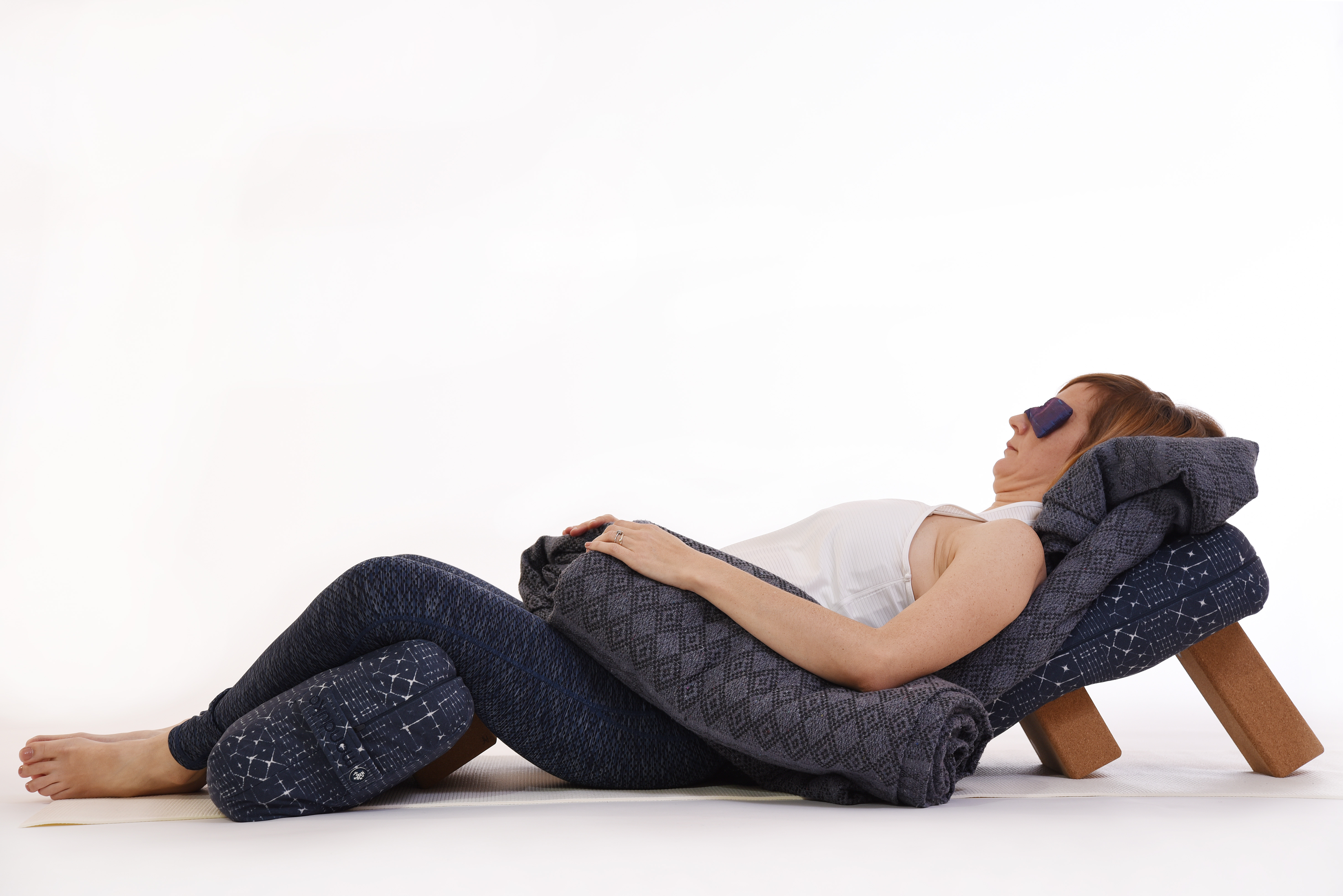 Props needed: a mat, two to three blocks, two bolsters, four blankets, and an eye pillow.